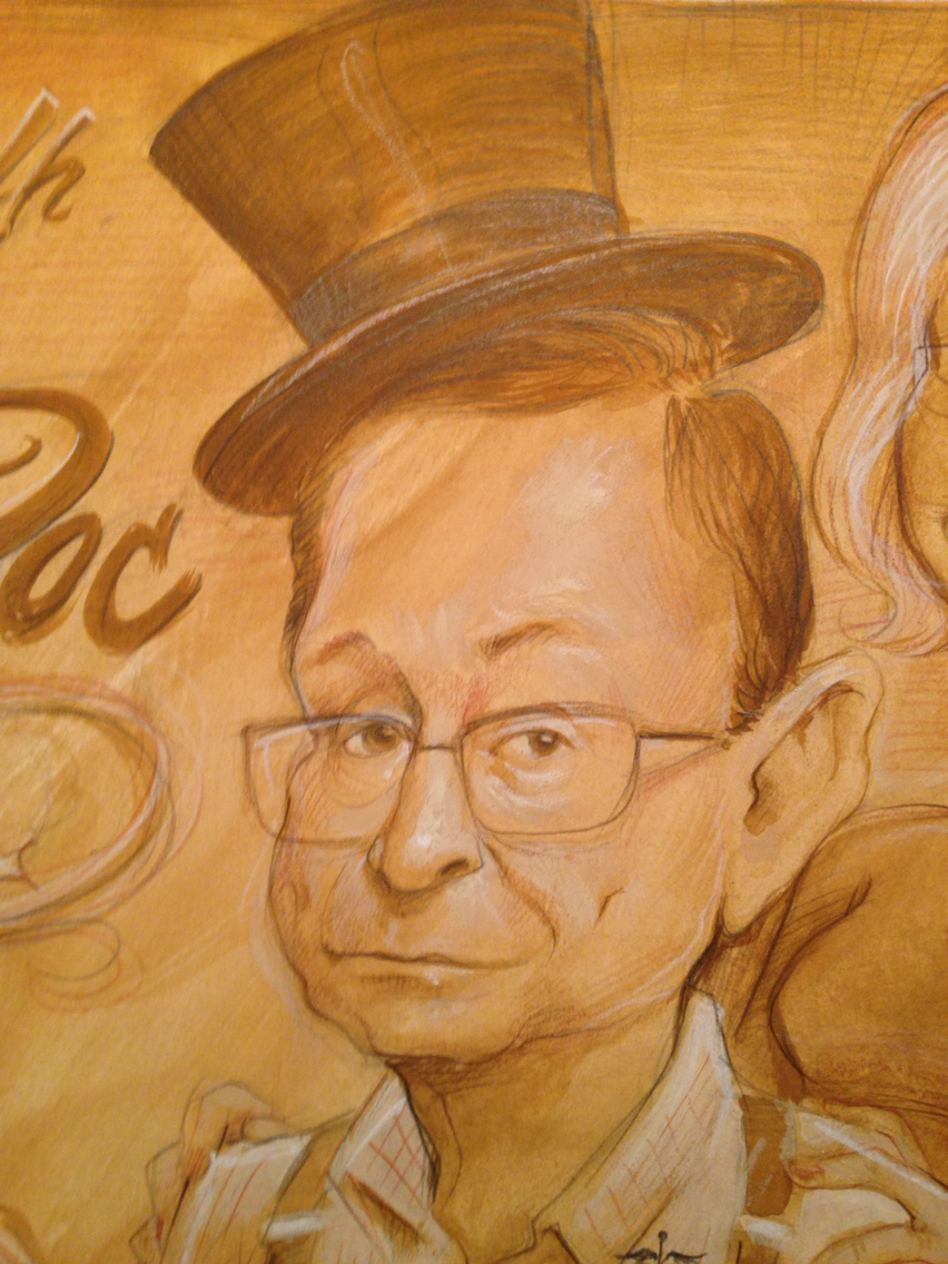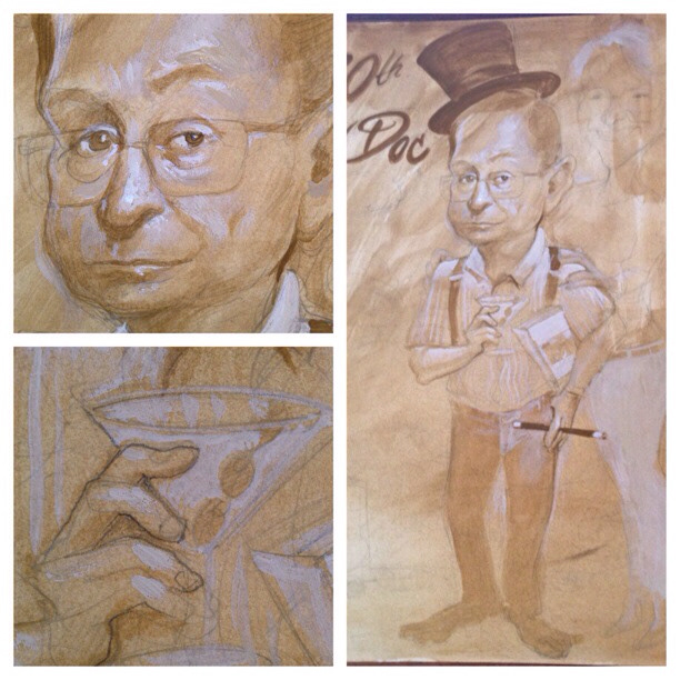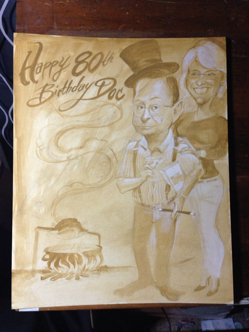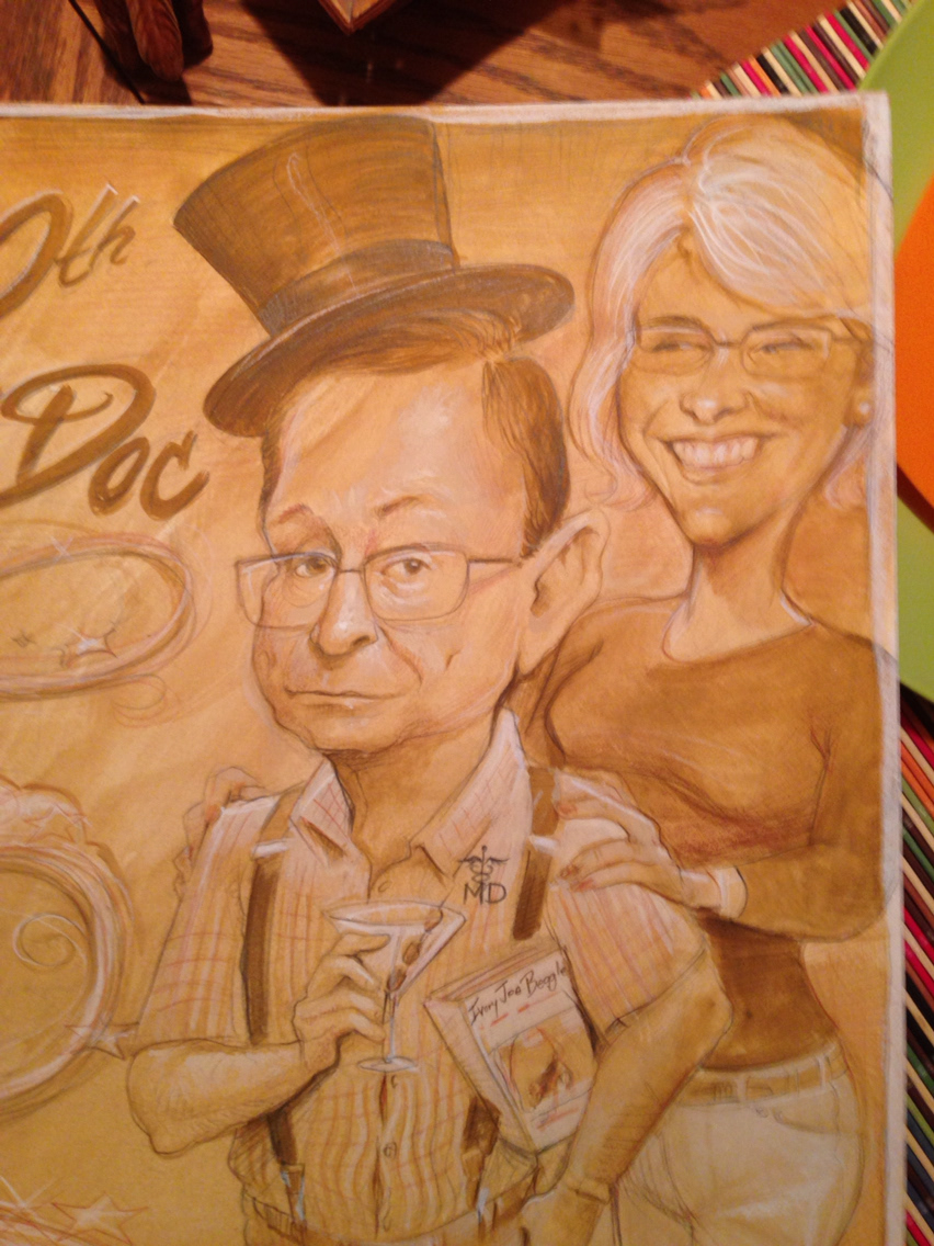 This is 80'th birthday gift Caricature of Doc. He is a magician, cook, doctor, and likes to cook, wears the all feet shoes, loves his wife!